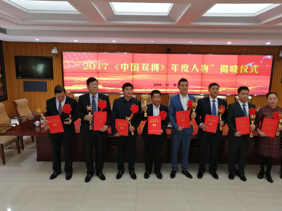 中国爱国拥军促进会会长罗平飞和广东省退役军人事务厅党组成员、副厅长饶美奕,江苏省退役军人事务厅副厅长徐卫,珠海市委常委、珠海警备区司令员毕敦发大校等,为2017《中国双拥》年度人物颁发证书和纪念杯,并集体合影。各省、市、区双拥办负责同志出席揭晓仪式。